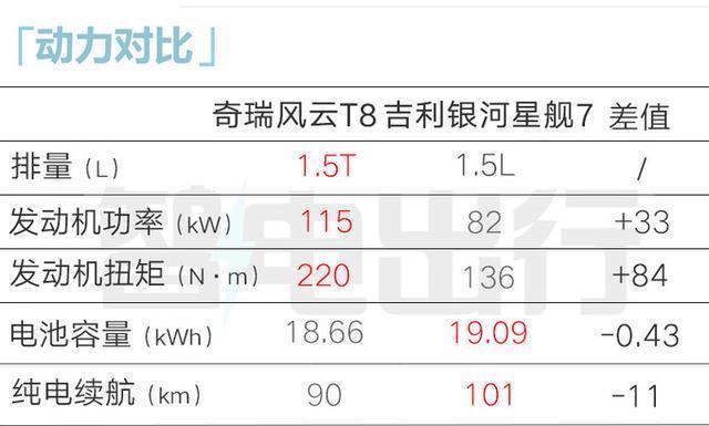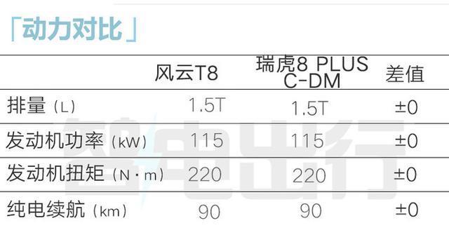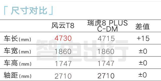 类似比亚迪王朝网宋Pro DM-i和海洋网海狮05DM-i,奇瑞风云T8和瑞虎8 PLUS C-DM则是一对“姊妹车型”,两者轴距、动力都一样。